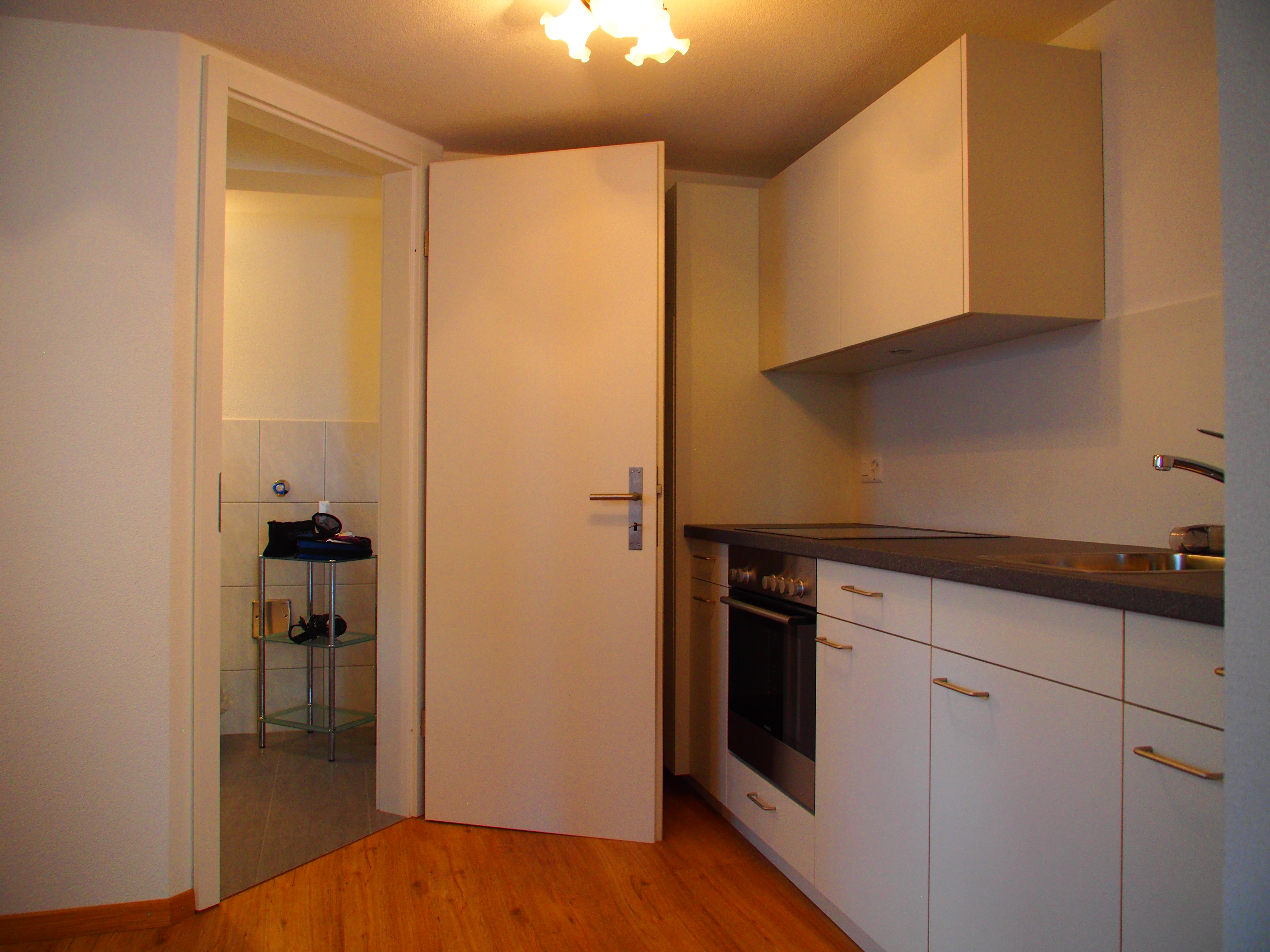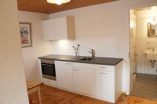 Kleinere Suite mit französischem Bett (160 cm), Bad und separatem Raum mit ausgerüsteter Küche, Kühlschrank und Essecke und Radio. Aussicht auf den Sächsmoor und in die Flumserberge.