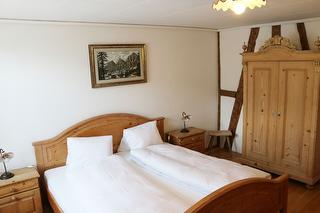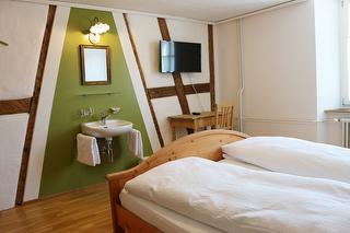 Geräumiges und gemütliches Doppelzimmer mit Fachwerk, Doppelbett und Schreibtisch. Dusche und Toilette befinden sich auf dem Gang, sind aber alleine, nur für dieses Zimmer reserviert.