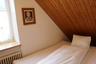 Einzelzimmer mit normalem Einzelbett und Schreibtisch. Toilette und Waschbecken befinden sich im Zimmer, die Dusche (nur für Mieter des Zimmers) auf der Etage. Es ist unser günstigstes Zimmer für Gäste, die nicht mehr brauchen.